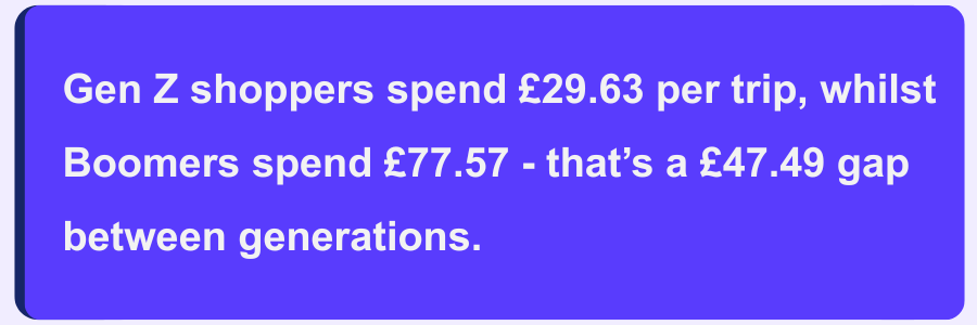 It's true - your parents really do spend more! Gen Z shoppers (18-24) average just £29.63 per basket, while Boomers (65+) spend £77.57 - a £47.94 gap. Millennials sit comfortably in the middle at £64.79, but it's Gen X (45-64) who dominate the aisles with £77.27 per shop.